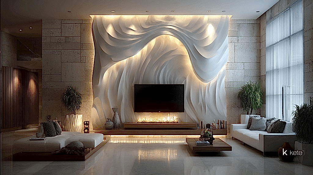 TV arkasına uygulanacak niş duvar modelleri, sadece dekoratif değil, aynı zamanda kullanışlıdır. Niş alanlara kitaplık, bitki veya aksesuar yerleştirerek hem estetik hem fonksiyonel bir kullanım sağlayabilirsiniz.