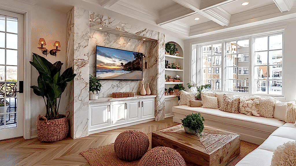 TV arkası duvarda sade ama etkili bir değişiklik yapmak istiyorsanız, dekoratif boya teknikleri veya kaliteli duvar kağıtları tercih edilebilir. Beton görünümlü sıvalar, mermer desenli vinil kaplamalar ya da pastel tonlarda dokulu boyalar ile şık sonuçlar elde edebilirsiniz.